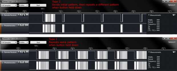 También por favor tomar nota de cómo el control remoto repite un patrón de códigos si se mantiene pulsado un botón. He probado dos mandos, uno repite el mismo patrón de todo el tiempo. La otra envía el comando y luego repite un patrón diferente para indicar cuando se mantiene pulsado un botón. Utilizaré el primero de ellos ya que podríamos tener problemas con el segundo tipo si echamos de menos el patrón inicial.