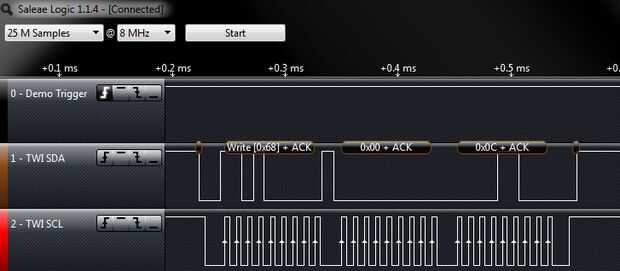 He incluido las formas de onda del analizador de lógica para que pueda ver claramente lo que I2C parece, la hoja de datos del DS1307 también muestra formas de onda similares, estudiar las formas de onda juntos mientras que también ha examinado los datos que se intercambian (como lo mando, cuál fue la respuesta), tratar de emparejar los eventos a los puntos en el código fuente.