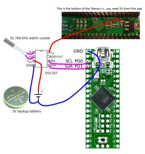Añadir primero el DS1307 para su circuito según mi esquema. Una mayor resolución de imagen es dentro del. Paquete ZIP. El punto importante es que el DS1307 necesita 5V, y nosotros hemos modificado la Teensy ++ a 3.3V, el diagrama le muestra dónde obtener 5V de Teensy ++.