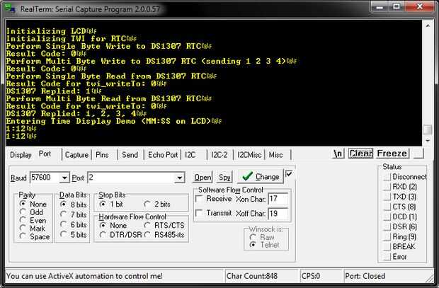 Une es una demostración de un programa simple que establece el tiempo y muestra el tiempo en su pantalla LCD. Demostrará mediante el bus de TWI para realizar operaciones de lectura y escritura de byte único o múltiple (ver las formas de onda que he proporcionado).