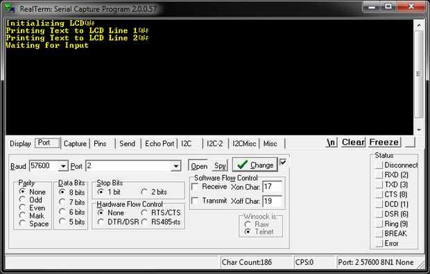 En este ejemplo primero se imprima "Hola mundo", entonces puede introducir caracteres a través de su terminal de serie (si está habilitado el "enviar pulsaciones de tecla").