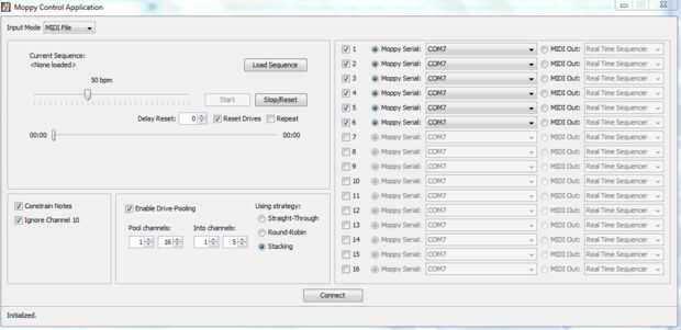 Finalmente, seleccione un archivo de MIDI que le gustaría jugar y presiona "Secuencia de carga". Haga clic en el botón "Inicio" hará que la canción que se transmitirá por un puñado de unidades de disquete.