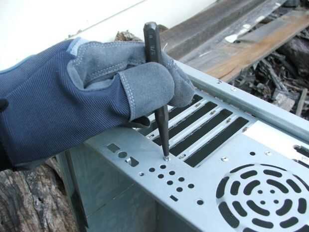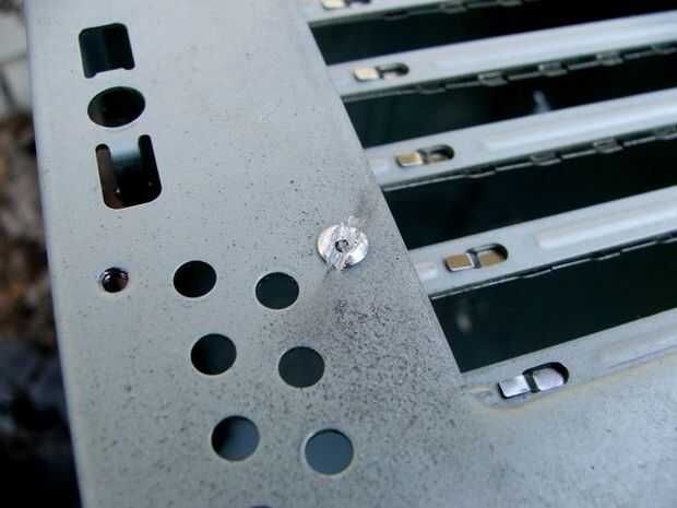 Si tu caja de la computadora, como el mío, tiene cualquier estúpidos remaches sosteniendo una pieza en la que no quieres, no corta el metal, simplemente deshacerse de los remaches. Usé una Dremel con un disco de corte de metal para cortar una ranura en el remache, una fue sólo un simple toque con un punzón y un martillo y el remache se había ido!