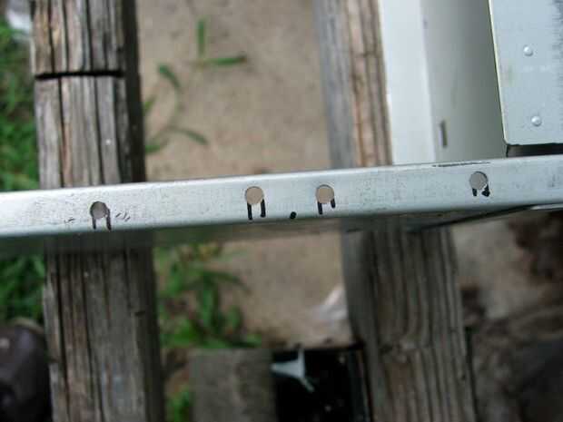 Poner su engranaje de estante en el caso nuevo donde quieras y medida donde los orificios se alineen con la brida de barandilla. A continuación, corte un agujero para que coincida con el tamaño de cualquier tornillo que está utilizando. He utilizado un tornillo de diámetro bastante pequeño, pero puedo actualizar a real rack tornillos cuando llegue la oportunidad. Mis tornillos pequeños funcionado bien, aunque. He utilizado un punzón para hacer una sangría, luego perforé el agujero hacia fuera con un taladro inalámbrico. Utilice una velocidad rápida y muy poca presión. Ahora sería un buen momento para busto de la broca pulida en la Dremel y limpiar las asperezas del metal cortado. También cubrí los bordes ásperos de metal con pegamento caliente para evitar que se corte, aunque la cinta puede funcionar mejor.
