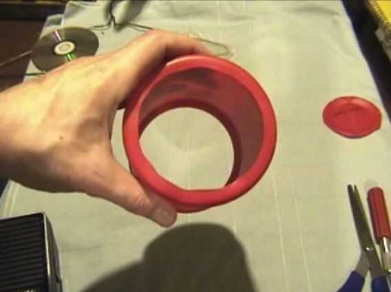 usé una lata de café plástico para el tubo de sonido quitando la tapa y cortar un agujero grande en la parte inferior. La forma con la aspiradora de la parte inferior de la lata le da una plantilla perfecta para cortar un agujero redondo agradable, grande dejando un labio alrededor del borde inferior.