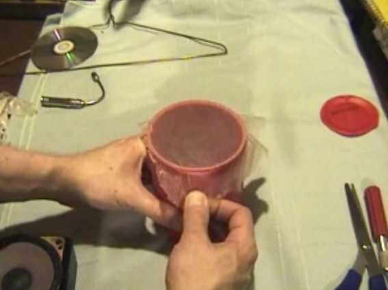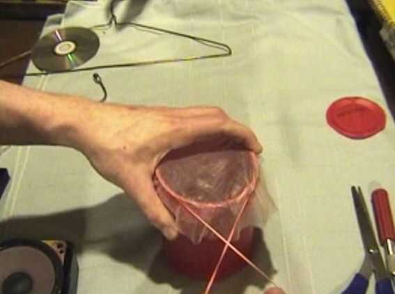 Cortar un guante de látex en una sección suficientemente grande como para cubrir la parte superior de la lata. Asegurar la membrana en la parte superior de la lata con una banda elástica. Tire de los bordes de la membrana hasta que la superficie de la membrana se tensa y uniforme. Recorte el exceso, si quieres ser aseado... =)