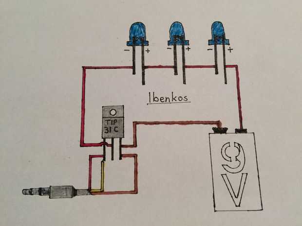 este es mi esquema modificado para ser utilizado con música LED luz caja Instructable de motadacruz.La idea es que, en lugar de usar sólo un canal de tu cable de audio, utilizando dos transistores puede usar ambos canales y alambre para separar caden