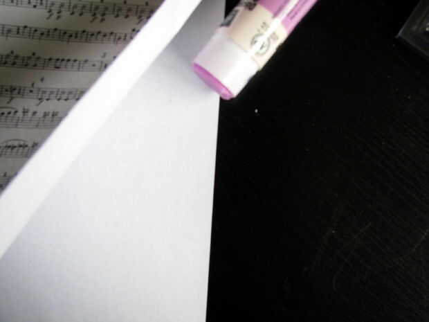 Para darle la guirnalda un aspecto muy profesional, acabado, tendrá que ser doble cara. Mis hojas de música la nota fueron de un solo lado, así que había que unir las hojas. Asegúrese de que pegue la hoja entera a la otra hoja, no sólo los bordes. Si no, vendrán aparte cuando recortas la forma porque el pegamento seco y agrietarse durante el corte y se desmoronan.