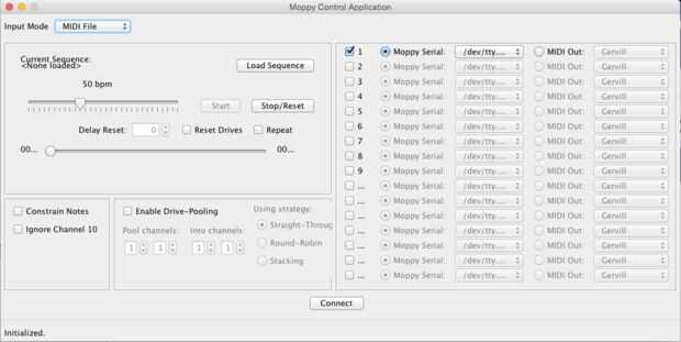 Asegúrese de que su Arduino está conectado al ordenador y ejecutar la aplicación de control de escritorio moppy. Espere un poco y aparecerá una ventana, llamada Moppy aplicación de Control. Si no lo hace, deberás cargar el código original en un java IDE y ejecutarlo desde allí. El código se puede encontrar aquí. A la derecha, asegúrese de que está activada la casilla de verificación con el 1 al lado de él y que al lado de él, está activada la casilla de serial moppy y que el cuadro de lista desplegable tiene el dispositivo correcto. Este debe ser el mismo dispositivo que ha seleccionado el IDE de Arduino. A continuación, asegúrese de que en la esquina superior izquierda del archivo de MIDI está seleccionada en el cuadro de lista desplegable. A continuación, pulse el botón de secuencia de carga y cargar un archivo midi. Por último, pulse conectar y luego cuando ha conectado Oprima Inicio.