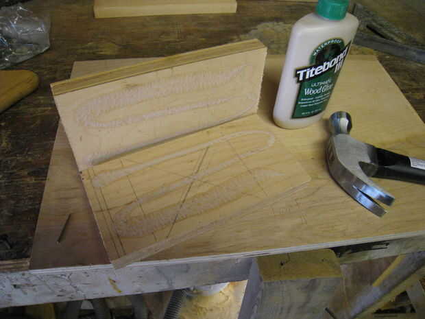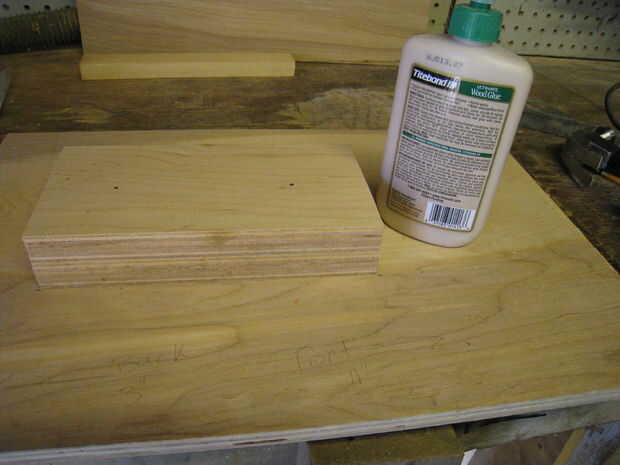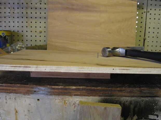 Poner pegamento entre los bloques de madera y clavar con clavos de acabado. Coloque el bloque entre las dos marcas realizadas en el contrachapado y el centro de lado a lado. Pegue abajo. La vuelta la base teniendo cuidado de no mover el bloque pegado y clavar desde la parte inferior con clavos de acabado. (Puede ser necesario esperar unos instantes antes de hacer esta parte dejar que el pegamento set)