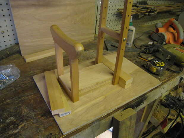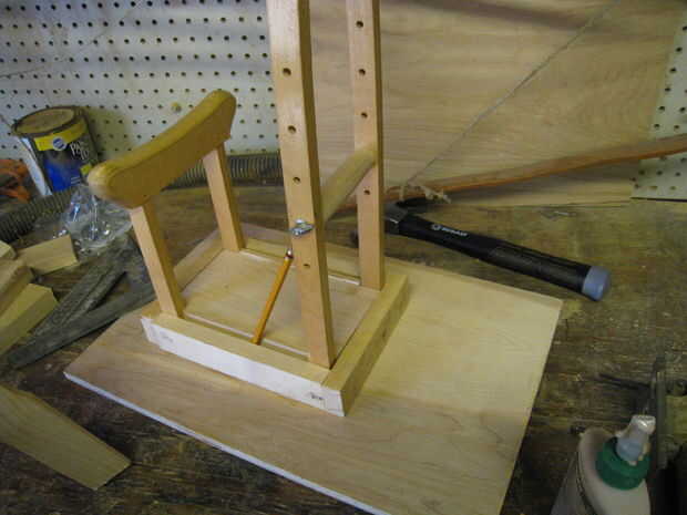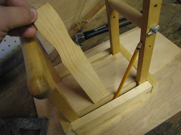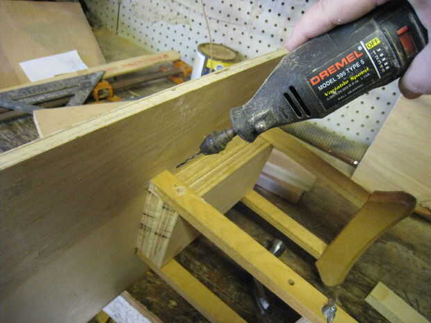Ahora se perfore agujeros guía a través de las muletas en el bloque de soporte de centro, tanto para que la madera de la muleta no se agrietará cuando manejamos clavos para acabado a través de asegurar, y también por lo que somos capaces de conducir clavos acabado a través la madera muleta. ¿(Resulta que muletas son sorprendentemente resistentes y casi imposible conducir un clavo, robusto? Vaya figura!) Usé una broca muy pequeña sobre el mismo diámetro como mis uñas acabado y una herramienta Craftsman Dremel.