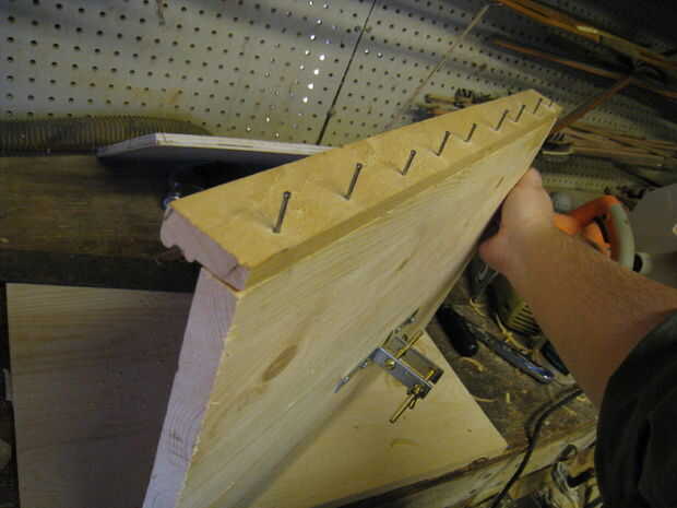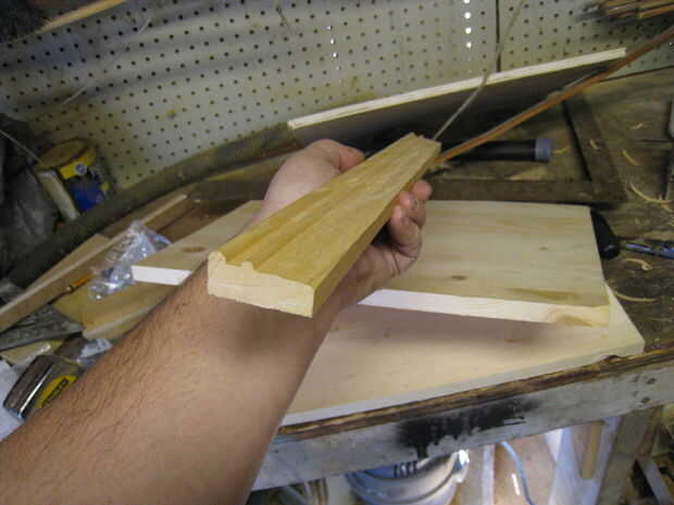 Lugar la pieza de adorno contra el fondo de la plataforma (el soporte en la parte posterior de la plataforma estará más cercano de la parte superior de la plataforma) Perfore orificios piloto de todo a lo largo de la parte inferior de la música de la ayuda en la parte inferior de la plataforma (no queremos que nuestro apoyo música ni nuestro estante para cuando ponemos juntos) ahora que tiene los agujeros piloto taladrados , pegue el soporte de música en la parte inferior de la plataforma y todos sus clavos de acabado en cada orificio pretaladrado. Entonces suavemente martillo cada uno sobre.