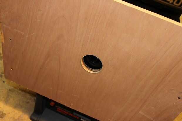 La caja de subwoofer dispone de un puerto en su parte posterior. Se realiza un orificio en la parte posterior de la caja de capas marinas que coincida con el puerto en la parte posterior de la caja de subwoofer negro.
