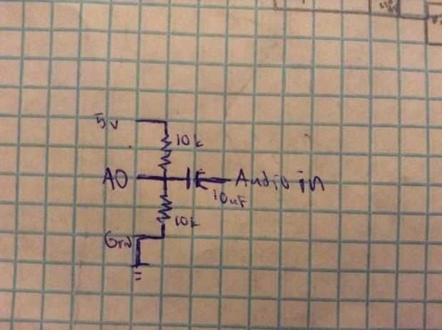 La entrada de sonido de arduino es lo que permite el arduino sincronizar automáticamente las luces de Navidad a la música. En primer lugar, tome un pedazo de perfboard y soldar en las patillas de la cabecera por lo que puede caber en pernos AO, grd, vcc y 5 voltios de arduino. A continuación, suelde una resistencia k 10 del pin A0 a tierra y un resistor de k 10 a 5 voltios. Luego, tomar un condensador de 10uF y soldar el extremo negativo al pin A0. Finalmente, la entrada del condensador, audio a tierra y un alambre vin para la alimentación de la soldadura.