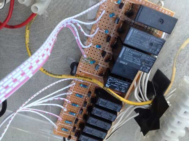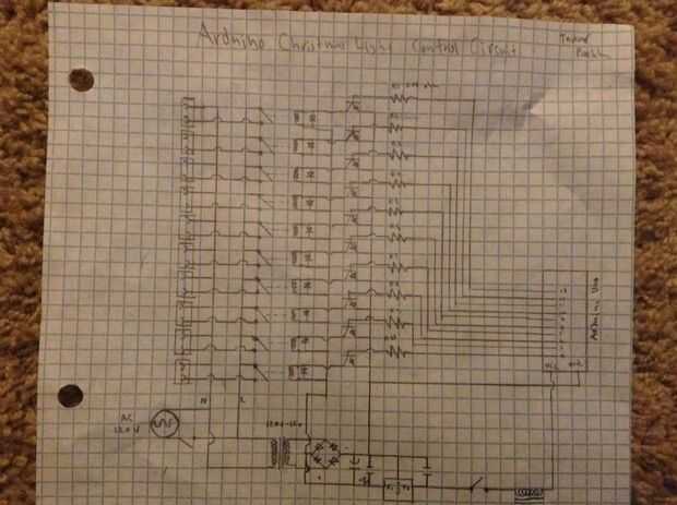 La placa de relé es lo que lleva las señales de salida de voltaje pequeño de arduino y los convierte en señales de salida de 120 v que pueden alimentar los filamentos de luz de Navidad. Para construir esta tabla, siga el esquema anterior. El arduino señales de flujo a través de un resistor de 220 ohmios en la base de un transistor. Esto activa el transistor y permite el flujo de corriente por el relé. La bobina del relé tiene un diodo a través de él en la polaridad opuesta para proteger el transistor de emf trasero. Uno de los contactos de cada relé se conecta a 120v vivo mientras que el otro contacto se va a un filamento de luz de Navidad. La placa de relé consta de 11 relés pero más o menos podría ser añadida para satisfacer sus necesidades. La placa de relé está conectada con el arduino a través de una franja de perfboard con cabecera pins conectados a él.