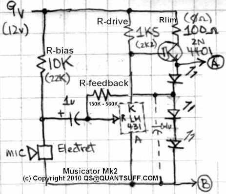 Realimentación R 150k a 560k. Usé 2 x 470 k en paralelo para conseguir 235k-ohm. Usar 150k para la sensibilidad más baja, es decir fuertes entornos. Esto está conectada a la parte superior de la LED rojo de 2 x.