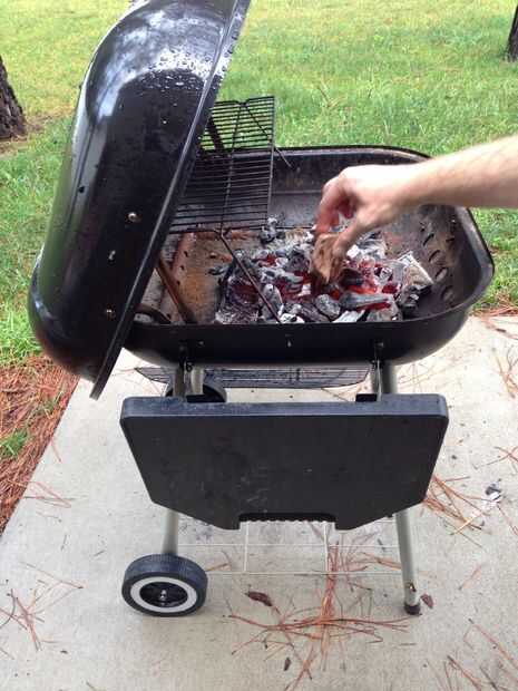 Cuando calienta el carbón, ponerlo en la parrilla. Añadir virutas de madera para realzar el sabor de las piernas de pollo.