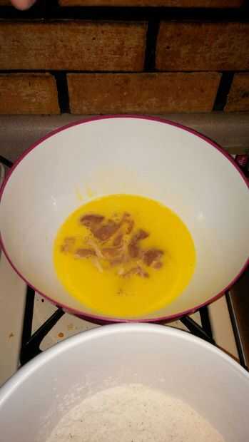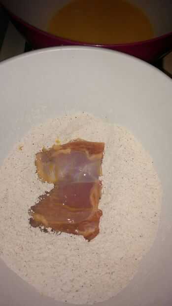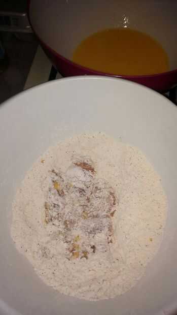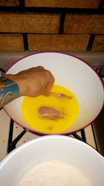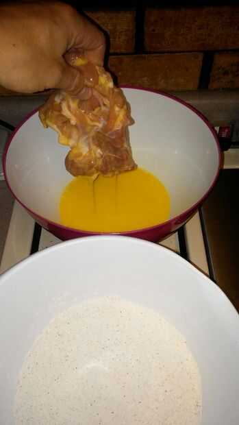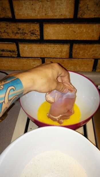 Bien, las fotos describen este paso perfectamente. Único Consejo aquí, es que el huevo al goteo apagado un poco antes que en la harina. Si no, terminarás con un pastoso lío antes de que el pollo ha sido sumergido.