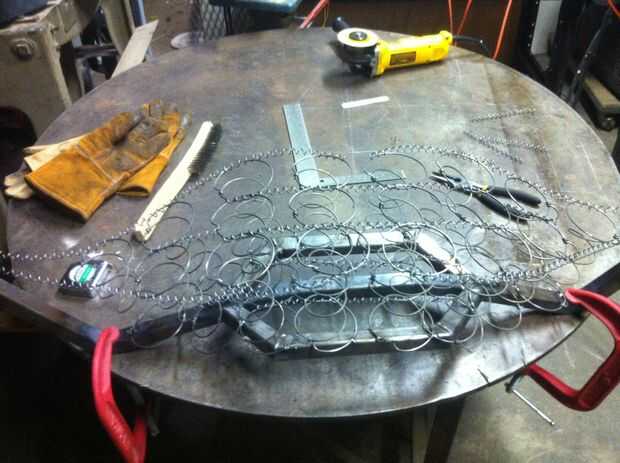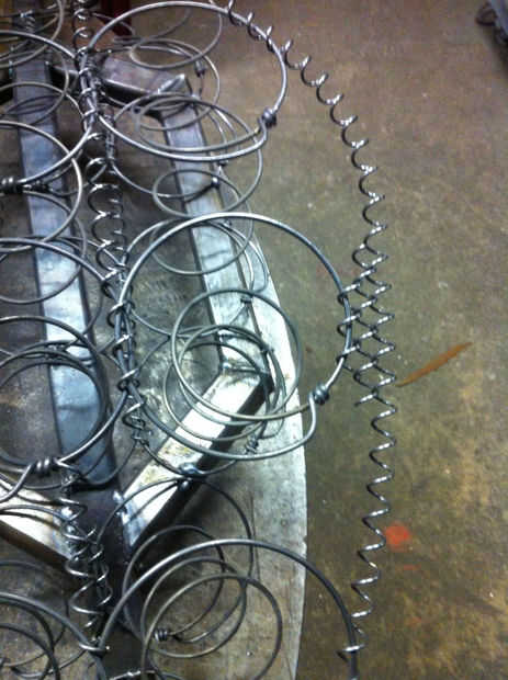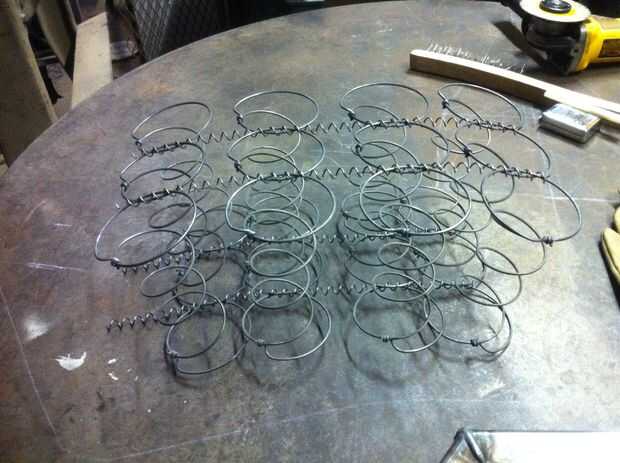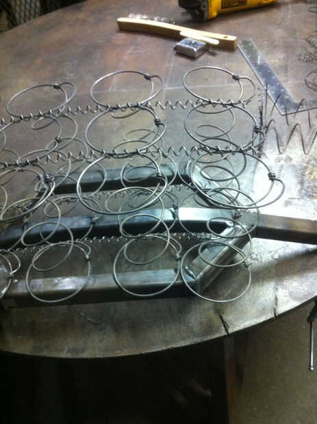 Los resortes vinieron encuadernados junto con otro tipo de resorte, un resorte espiral largo, que se enrolla alrededor de dos de los grandes muelles a la vez, para mantenerlos juntos hacia los lados. Las tapas de los resortes tenían una espiral y así los fondos. Y puesto que la espiral funcionaron el ancho del colchón, también llevó a cabo los resortes a través. La Unión lateral era muy apretada, pero Cruz había 3/4" o menos separar cada primavera. Decidió retener a algunos de estos resortes de Unión, pero les reposicionado en la parte inferior para dar a todo el conjunto una curva para que coincida con la forma del marco.