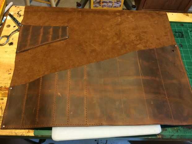 Estoy divagando. Para coser los paneles interiores adecuada para el cuerpo principal que tenemos para asegurarse de que las llaves estén alineadas en una 90 grados orientación perpendicular (recta hacia arriba y hacia abajo) desde el borde inferior del panel del cuerpo principal y debidamente espaciadas para acomodar el extremo del zócalo inclinado en la parte inferior. Lo bueno es que incluso si usted no espacio adecuado, este cuero ropa previamente engrasado es muy indulgente y relajará con la correcta aplicación de la fuerza bruta y la ignorancia.