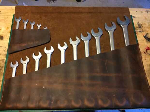 Una vez que se establecen el espaciado y alineación Presione la piel alrededor de las herramientas para formar una impresión sobre el cuero. Retire las llaves y, si tienes uno, utilizar la regla de 90 grados para marcar una línea entre cada impresión de llave (recta hacia arriba y abajo) de la parte inferior. Antes de empezar sacudiendo alrededor con su mazo como si estuvieras jugando whack a mole que ayuda a asegurar los paneles primero para evitar desplazamientos durante el proceso. Puse los remaches en la esquina de cada panel interior. Esto también agrega fuerza y estabilidad cuando las herramientas se quitan repetidamente y reemplazadas durante la vida del rodillo. Desde allí puede tomar su cincel thonging, lezna o punzón para hielo y meter agujeros en los paneles de interiores y panel del cuerpo principal. Esto es en última instancia cómo será coser todo junto.