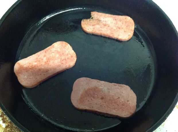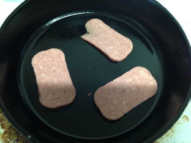 a fuego medio, rocíe Pam en la sartén y freír las rebanadas de spam. Cada lado del tirón cuando esté dorado crujiente. Desmoldar cuando completamente cocido.