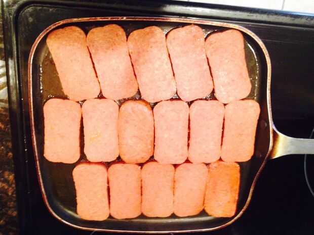 Entonces pan freír su spam sobre fuego medio. No necesita agregar aceite. El spam es lo suficientemente graso no se adhiera. Asegúrese de que para freír hasta obtener una costra agradable en el exterior.