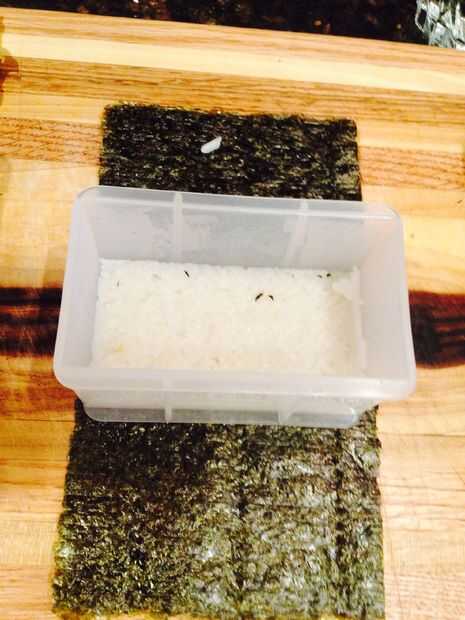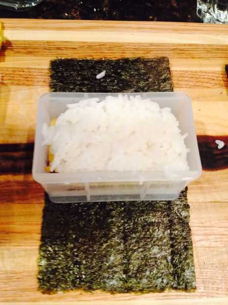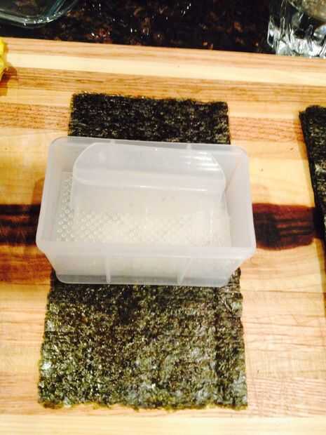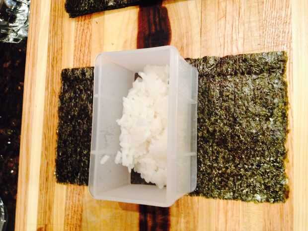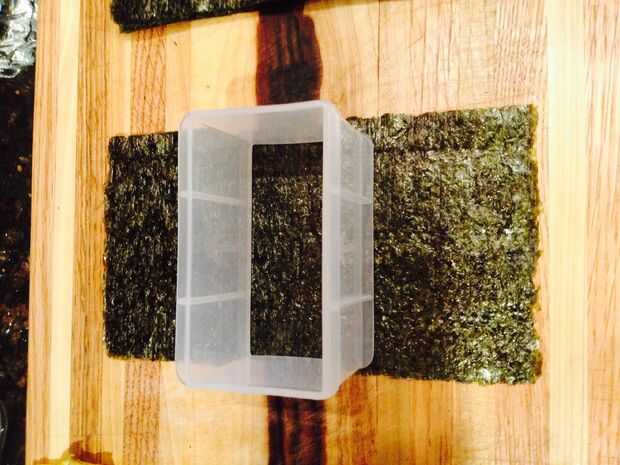 Paso 6: sumergir los dedos en un vaso de agua y humedecer el extremo de su Nori. Luego envuélvalo para arriba.