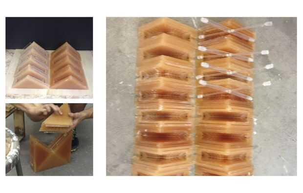 Para este paso, hemos creado varios moldes de poliuretano con el fin de maximizar la eficiencia para el resto del proceso. Aquí, preparamos los moldes introduciendo una pieza de acrílico a unirse a ellos en la negativa de un grupo, y también tubos de plástico insertado que se ejecutan a través de cada módulo para que pueda insertarse un cable para conectar varios paneles juntos.