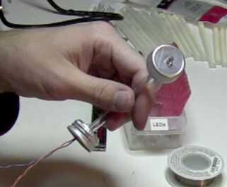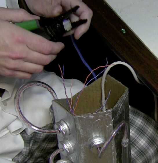 Yo quería proporcionar una conveniente manera encubierta para disparar las armas, por lo que también montara en el pasador de cuatro botones grandes (Sparkfun vende para $5 por 12 botones) y había cubierto todo con un trozo de arenado de corte plástico de una caja de galletas. La forma más fácil para disparar el arma sería incorporar una batería dentro de la armadura y usando los botones para proporcionar energía a los LEDs a través de diferentes resistencias. Decidí usar de forma más compleja y conecte todos los botones y LEDs del traje entero a un concentrador central. De esta manera yo les puedo conmute a cualquier forma que desee. En lugar de vincular todas las conexiones una de usar dos cables UTP5 (los utilizados para conectar su computadora a internet por cable de forma). Si se corta este cable puede encontrar 8 cables dentro de terminado con un conector RJ-45. Sparkfun vende tomas RJ45 (Asegúrese de que usted compre las más sencillas sin magnetismo) que permiten conectar los cables en el otro lado de la conexión.