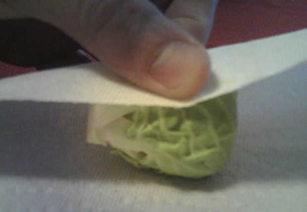 Seleccione un globo verde y tira cuatro o cinco de las hojas verdes oscuras exteriores. Me parece que sean amargas. Luego corte una astilla del vástago, para quitar la broca marrón fea, pero apenas una astilla, porque necesitamos el tallo, y es super sabroso. (Foto 2)