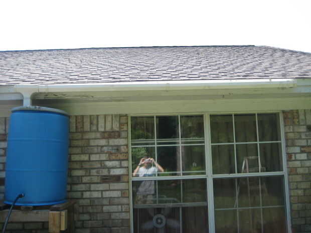 La manguera de plástico negro fue rescatado de un proyecto de riego mi papá trató de un tiempo atrás. Regar mi jardín en tercios con una palefull verde, esperar un par de minutos para absorber el agua y volver a hacerlo. Con una buena lluvia, mi barril se llena en 5-10 minutos, y sólo usar una pequeña sección del canal.