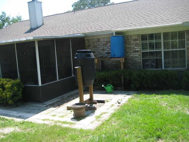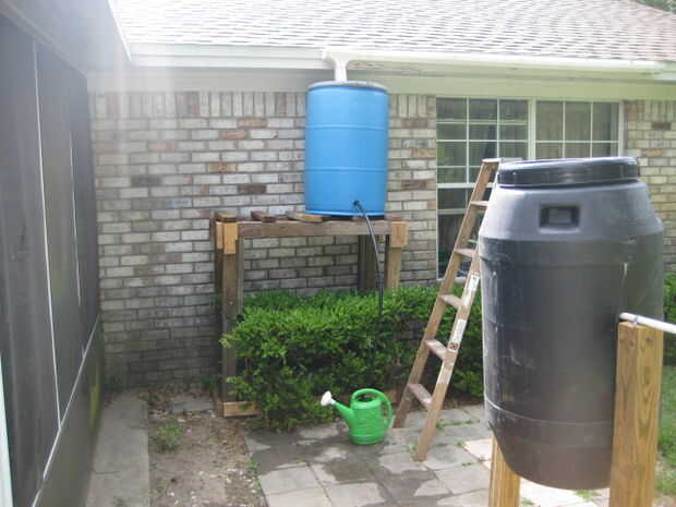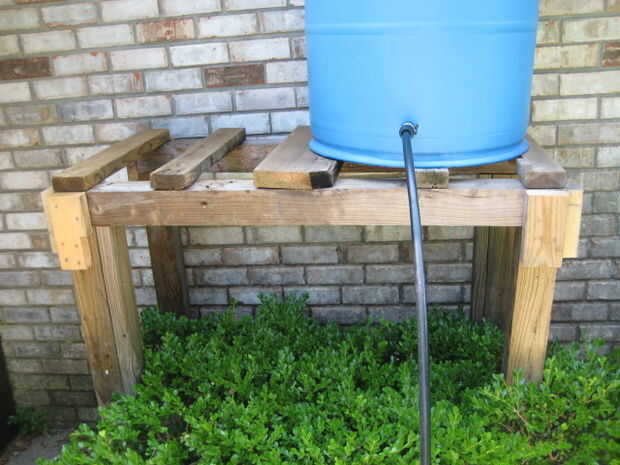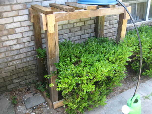 He construido una estructura para sostener mi barril y un barril de futuro sólo sobre algunos pequeños arbustos con suficiente espacio para recortar aún los arbustos y justo debajo del pico de la canal. Toda la madera que usé ya estaba en mi garaje por lo que no es el mismo tono, marca, origen, etc. pero se recicla que servía para otra cosa en un momento dado. Las patas son 4 pies 4 x 4, 2 sit más 4 pie 4 x 4 sobre 2 patas cada uno y ejecutar a lo largo (el poder principal), 4-2 2 x 4 de pie sentarse encima de estas con un pie 2 2 x 8 en el centro (2 barriles que pueden compartir el medio tablón), caja de 2 x 4 en la parte inferior de la estructura para la rigidez, y finalmente cortes pequeños de 2 x 4 atan la tapa a lo largo 4 x 4 en las patas. Como una nota; la 2 x 4 conectado a la parte posterior izquierda delantera y derecha las piernas existen sólo porque no podía obtener todos los clavos hacia fuera para quitarlo cuando recuperación de ese 4 x 4.