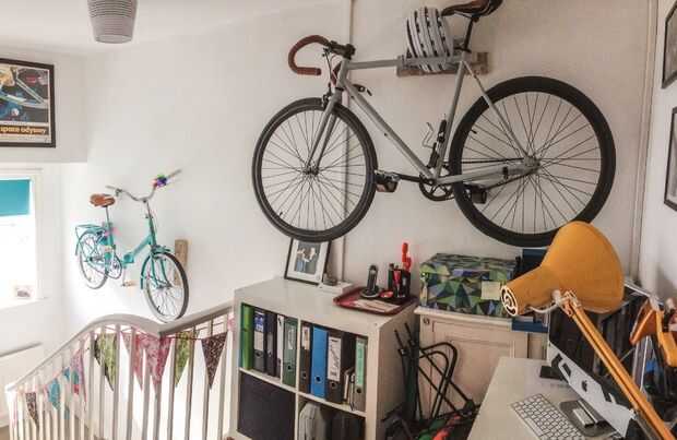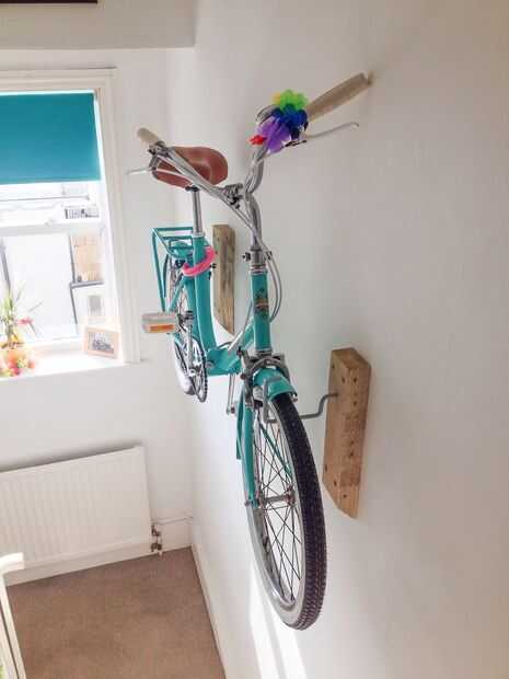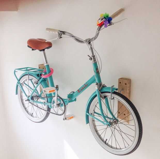 me dieron una 1967 plegable Bianchi bicicleta vieja (y muy muy oxidada) por un amigo. Después de la remodelación de mi novia me di cuenta que era tiempo para hacer otra pared de montaje. Utilicé la madera restante desde el proyecto original de la plataforma y un par de ganchos revestidos de goma similar.