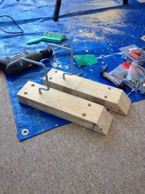 He cambiado el diseño un poco porque la moto pesa más de 20kgs. También no tiene un travesaño recto así que decidí colgarlo por las ruedas. Los tornillos y tacos son clasificados para aguantar unos 60kg cada uno así que 8 debe celebrar alegremente esta moto poco.