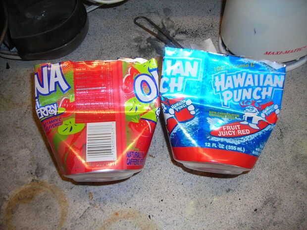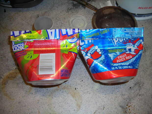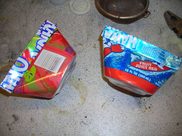 Aplanar de 1 pulgada de la parte superior de cada lata. Doble hacia abajo 1/2 pulgada y apriete con los alicates. Doble hacia abajo uno más 1/2 pulgada y abrazadera de cierre con las pinzas otra vez. Ahora tienes dos opciones. Si vas a rellenar cada con más de 11-12 gramos de composición, recomendaría usando el opcional perno y la tuerca para evitar que la puede desplegar durante la ignición. Cuando se quema, esta composición produce mucho humo, que se escapa muy rápidamente. ¿Si el humo es lanzado demasiado rápido y a muy alta temperatura, de sólo tendremos un pequeño lanzallamas en las manos, que es multa y dandy pero quiero humo, derecho? La segunda manera de hacerlo, es simplemente doblar los bordes, como se muestra en las fotos.