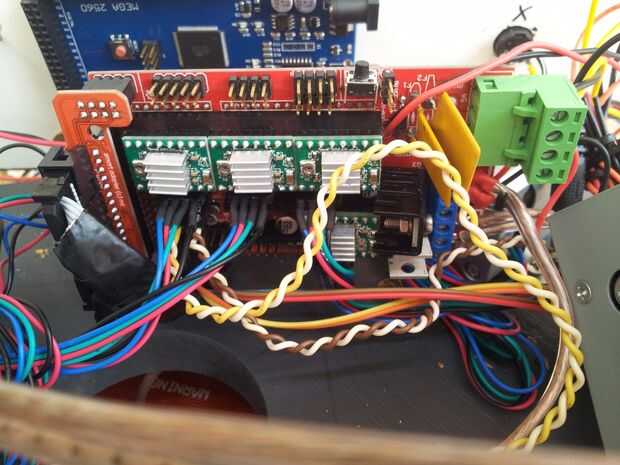 Primero pongo los motores de eje en la base inferior, dentro de la caja. Después puse la electrónica y, conectado esta vez que me conecto todos los componentes.