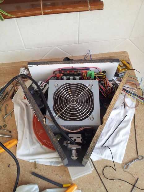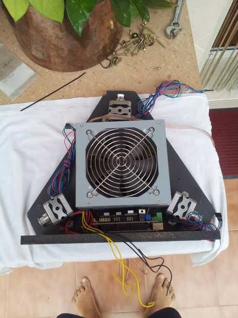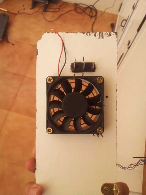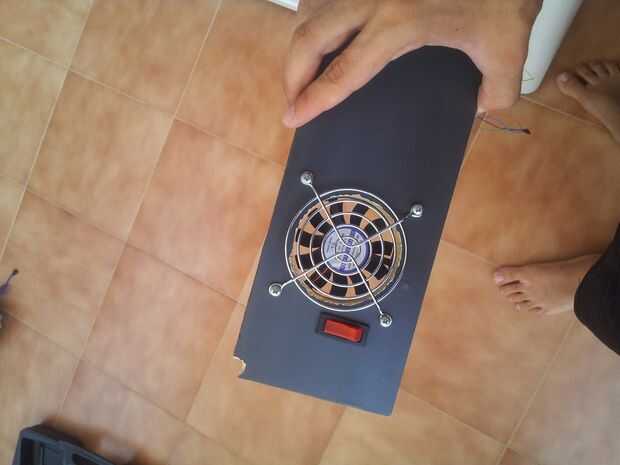 La siguiente puse la fuente de alimentación entre motores de te, en el centro de la caja inferior, poner el ventilador, la interrupción y el LED y cerrada la caja con las demás tablas.