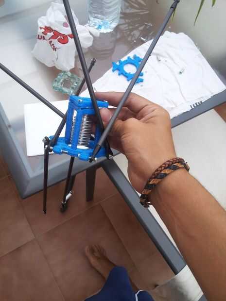 Montar la fibra de carbono y el e3d hotend pedazo de centro y unirlos a las piezas de carros con rodamientos lineales conectados a ellos e introducir barras de acero lisas en rodamientos.