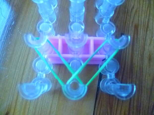 * punta si esta es su primera vez haciendo e intermedio nivel pulsera sugiero usar los mismos colores.Primero consigues una banda de caucho (verde) va en la clavija media y poner diagonalmente hacia arriba a la izquierda y luego de la misma a la dere