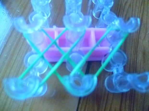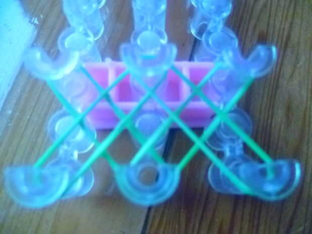 * punta si esta es su primera vez haciendo e intermedio nivel pulsera sugiero usar los mismos colores.Primero consigues una banda de caucho (verde) va en la clavija media y poner diagonalmente hacia arriba a la izquierda y luego de la misma a la dere