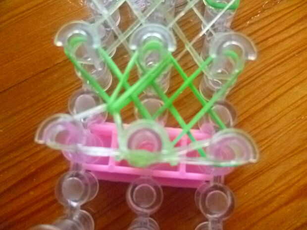* punta si esta es su primera vez haciendo e intermedio nivel pulsera sugiero usar los mismos colores.Primero consigues una banda de caucho (verde) va en la clavija media y poner diagonalmente hacia arriba a la izquierda y luego de la misma a la dere