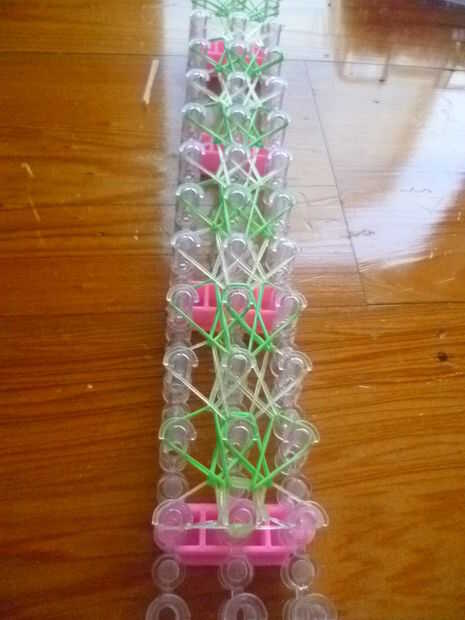 * punta si esta es su primera vez haciendo e intermedio nivel pulsera sugiero usar los mismos colores.Primero consigues una banda de caucho (verde) va en la clavija media y poner diagonalmente hacia arriba a la izquierda y luego de la misma a la dere