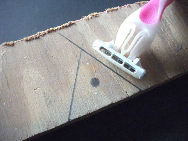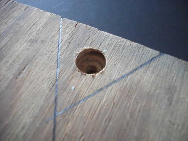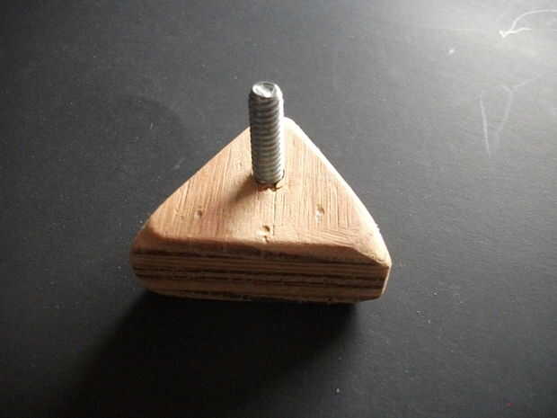 * Comienzo marcando de una 2 "x 2" x 2 "triángulo en el desecho de la madera. No corte esto todavía. * A continuación Marque el centro de su triángulo, tomar la 1/2" diámetro broca y perforar un agujero lo suficientemente profundo para cubrir la cabeza del perno.