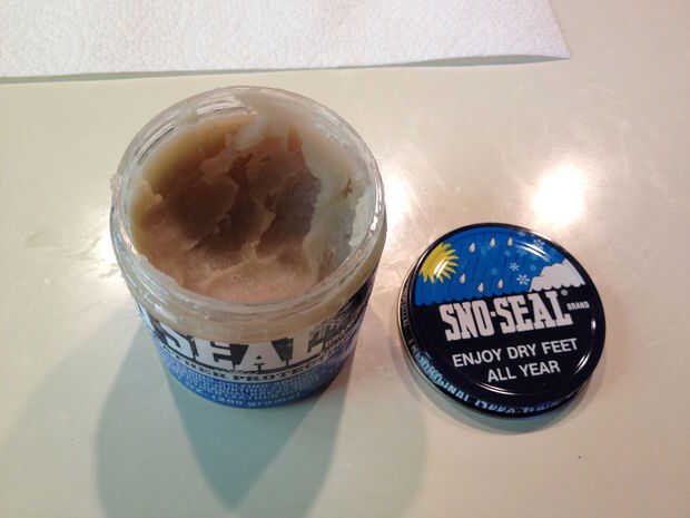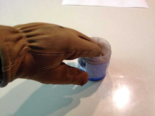 Te darás cuenta de que con cada capa, los guantes de Obtén un poco más oscuros (ver el antes y después del cuadro - los guantes de la izquierda han es impermeable). Al final del proceso, debe haber aproximadamente un tercio de la jarra (si tiene el tamaño de 8oz) ido.