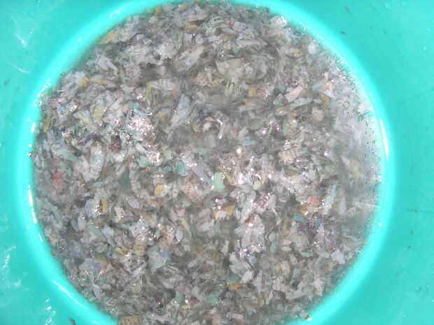 Usando sus manos, triturar el periódico en trozos pequeños. También se puede utilizar una batidora.