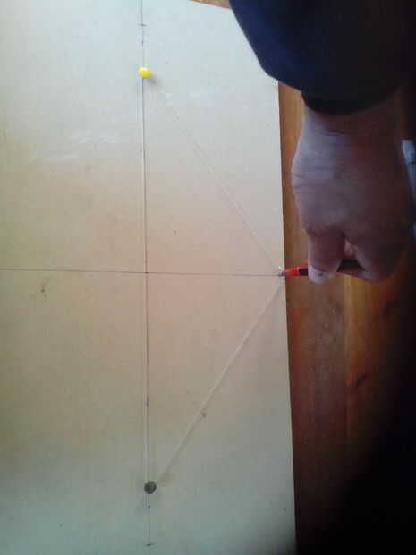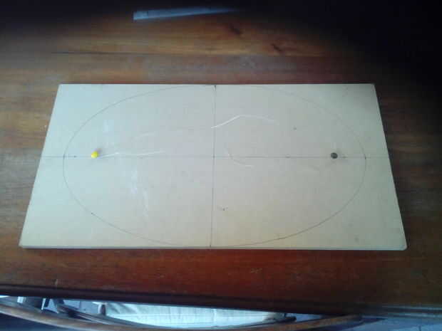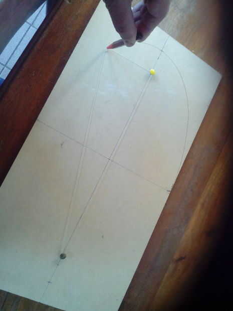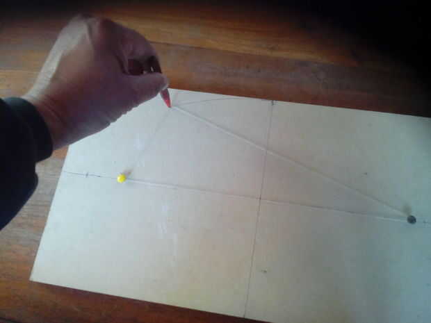 Pellizcar un alfiler en cada foco, entonces con una tanza o hilo une el punto superior y el enfoque, esta longitud constante que nos dejan para dibujar la elipse, como se ve en las fotos