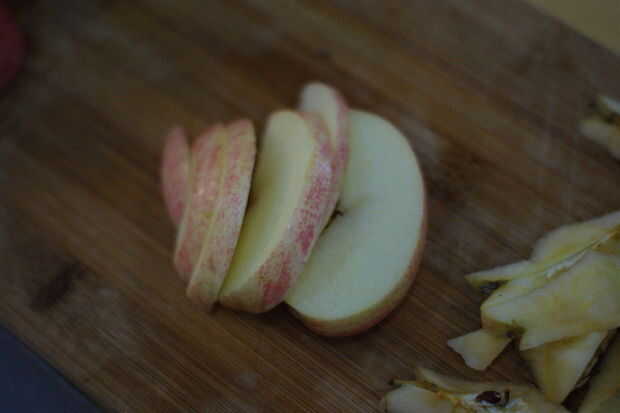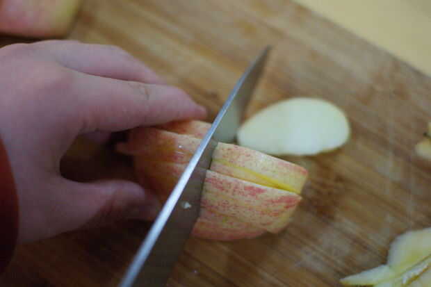 4. ahora toma las manzanas en rodajas y cortar por la mitad como se muestra en la foto de arriba.