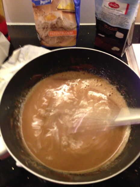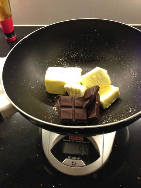 Coloque el recipiente sobre la báscula y ajustar a cero (Tara). Poner 125g de mantequilla en la sartén y 50g de chocolate negro. Agitando constantemente, derretir la mantequilla y el chocolate. Mientras tanto hervir algo de agua.