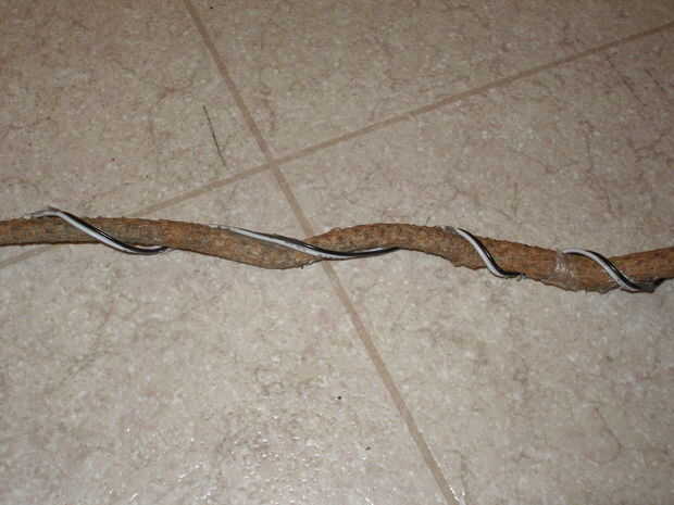 Una vez que el palo se prepara, envuelva dos cables en toda su longitud. (En una versión, marcado con rayitas cruzadas los. Usando un cable de color ámbar, agregaron un patrón agradable al producto general.) Una vez que tengas los cables en su lugar, tira de ellos para descubrir el conductor.